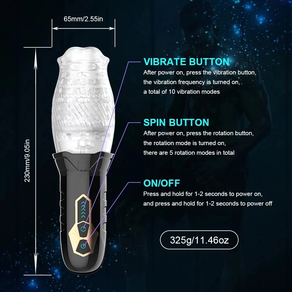 Designed to realistically simulate oral sex by stimulating the head of the penis with rotation and vibration, The Male Rose is a hand-held masturbator with a stretchy textured cup, a pair of luscious lips at the opening, and a conveniently long handle.
